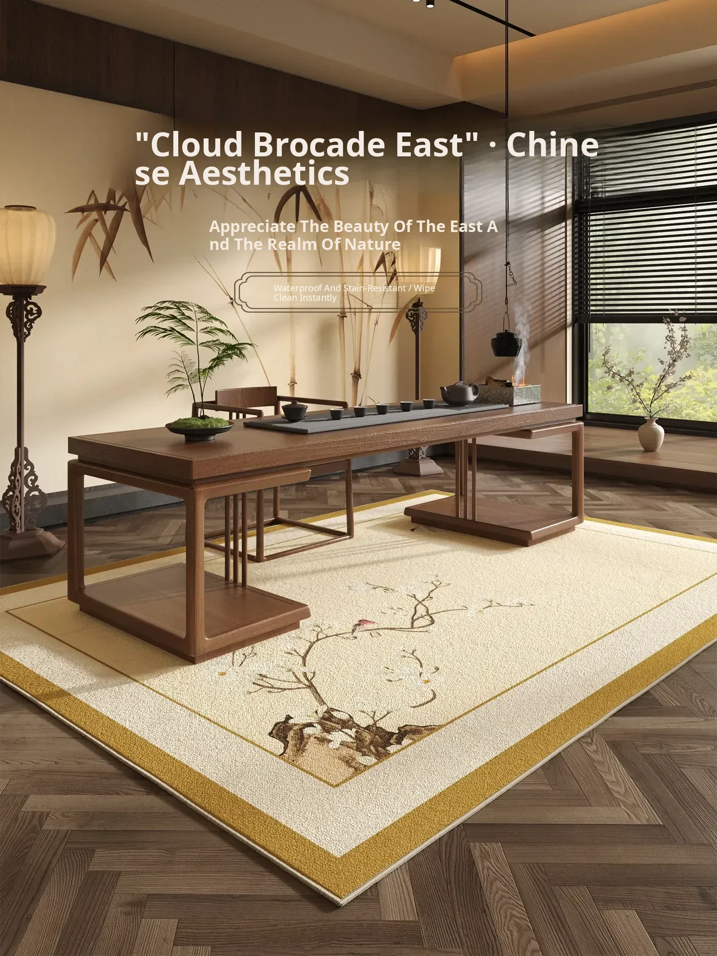 Elegant Chinese Style Living Room Carpet - Waterproof and Stain-Resistant Bedroom and Tea Table Mat, Perfect for Zen Ambiance in Your Home