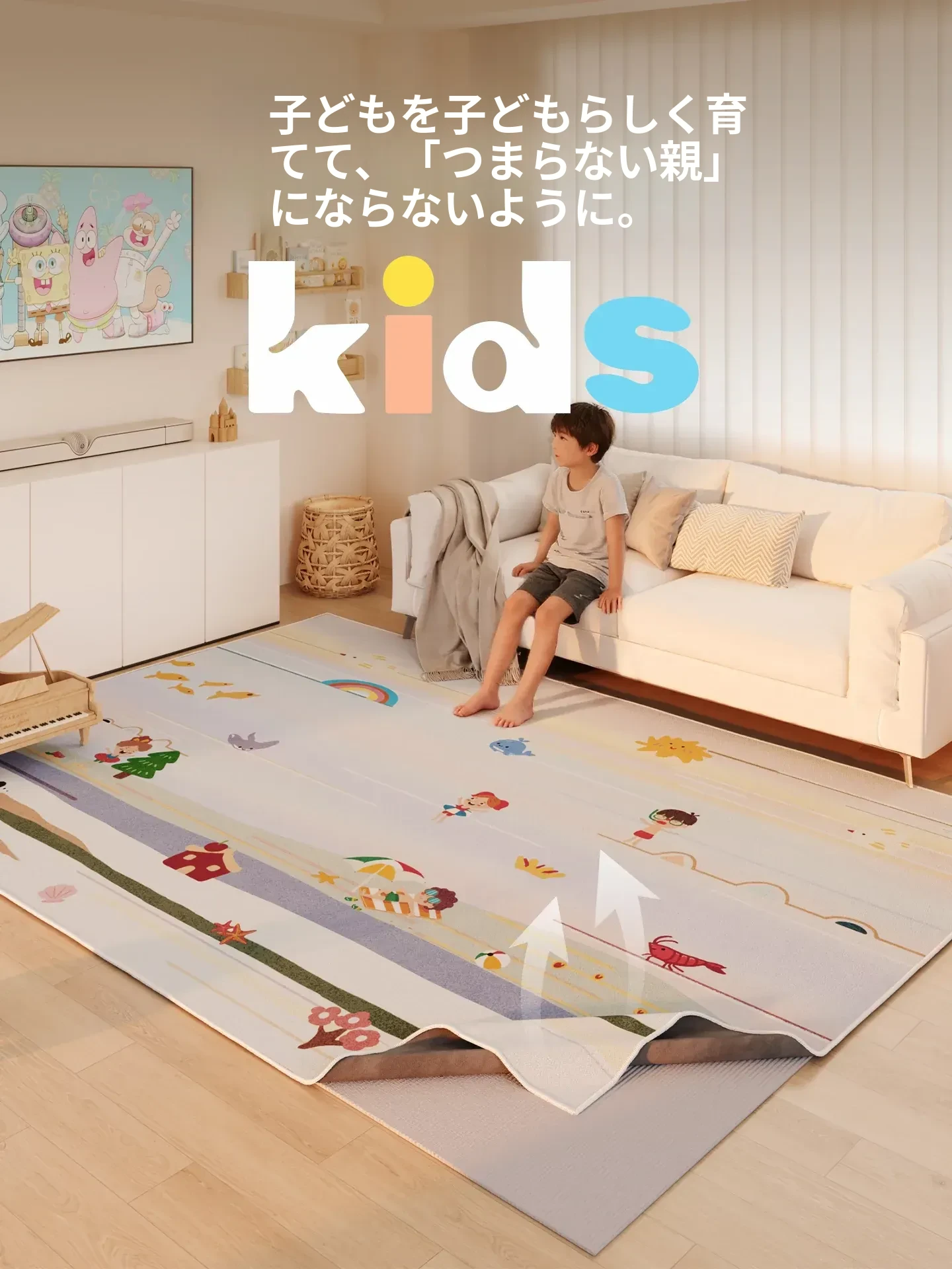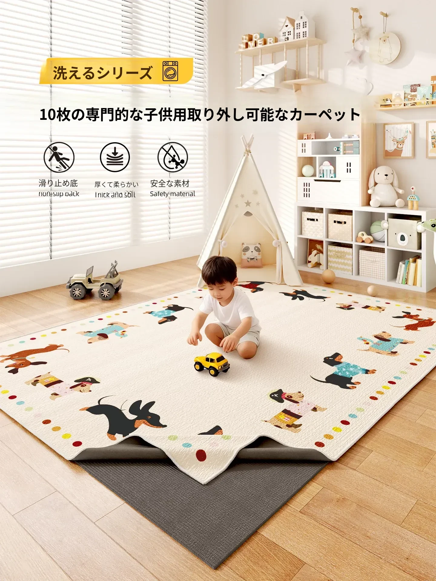 本格的に洗えるカーペット!リビングや子供部屋に最適なかわいい犬のデザイン。二重構造のゲームマットで、お子様のハイハイにもぴったり!洗濯機で簡単に洗えるので、いつでも清潔に保てます。