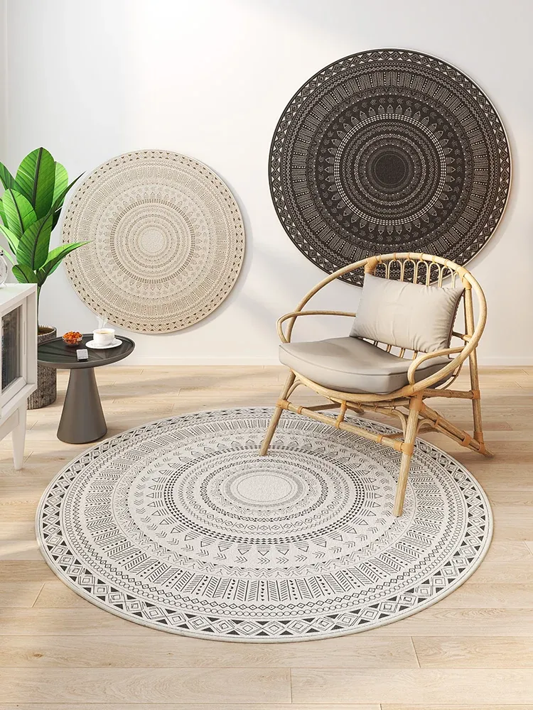 北欧スタイルのラグ|現代的なリビングにぴったり!軽やかな高級感を演出するインスタ風の回転椅子と円形ラグ|寝室やドレッサーにも最適!