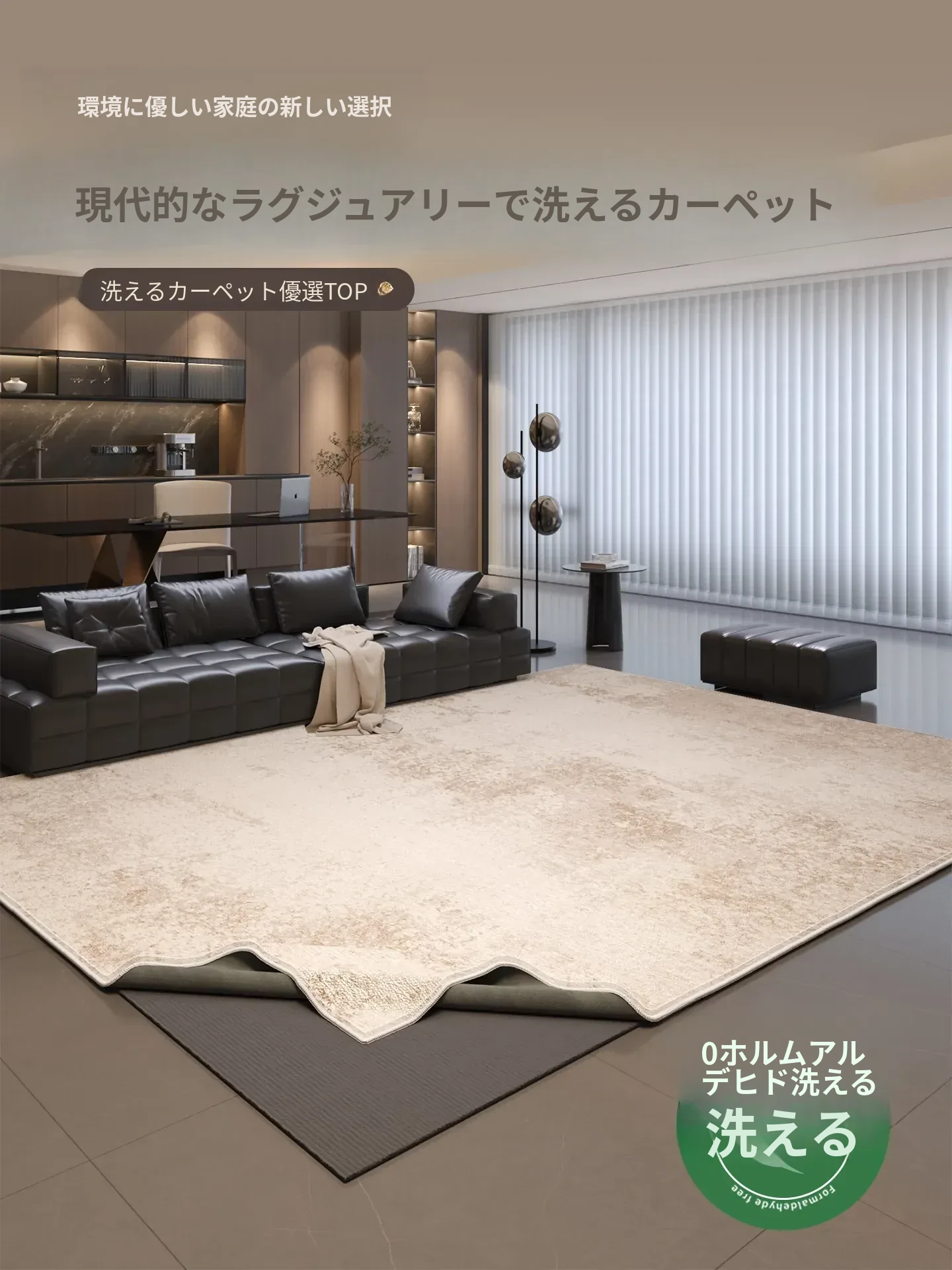 洗える高級感漂うリビング用ラグ!ソファやベッドサイドにぴったりの二重構造カーペット。手間いらずでお手入れ簡単、快適な空間を演出します。