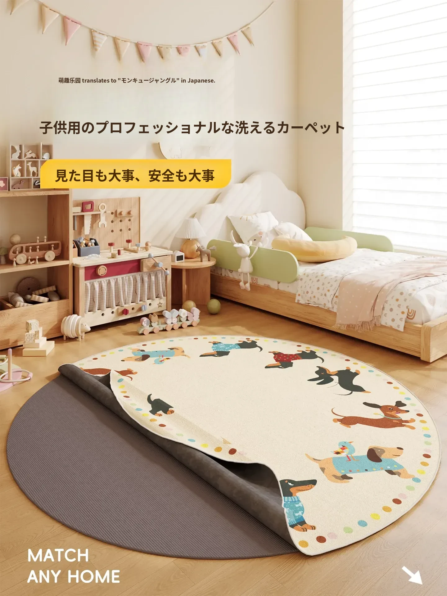 子供部屋用の丸型洗えるカーペット、かわいい犬のデザイン!ダブルレイヤーのゲームマットは滑り止め付きで、赤ちゃんのおすわりやハイハイにも最適。洗濯機で簡単にお手入れできて、安心して遊べる空間を提供します!