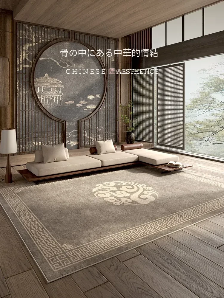 中式風格のリビングルームカーペット|和の雰囲気漂う寝室用ベッドサイドマット|レトロな茶卓マット|禅の美しさを感じるグレーのフルカバータイプ