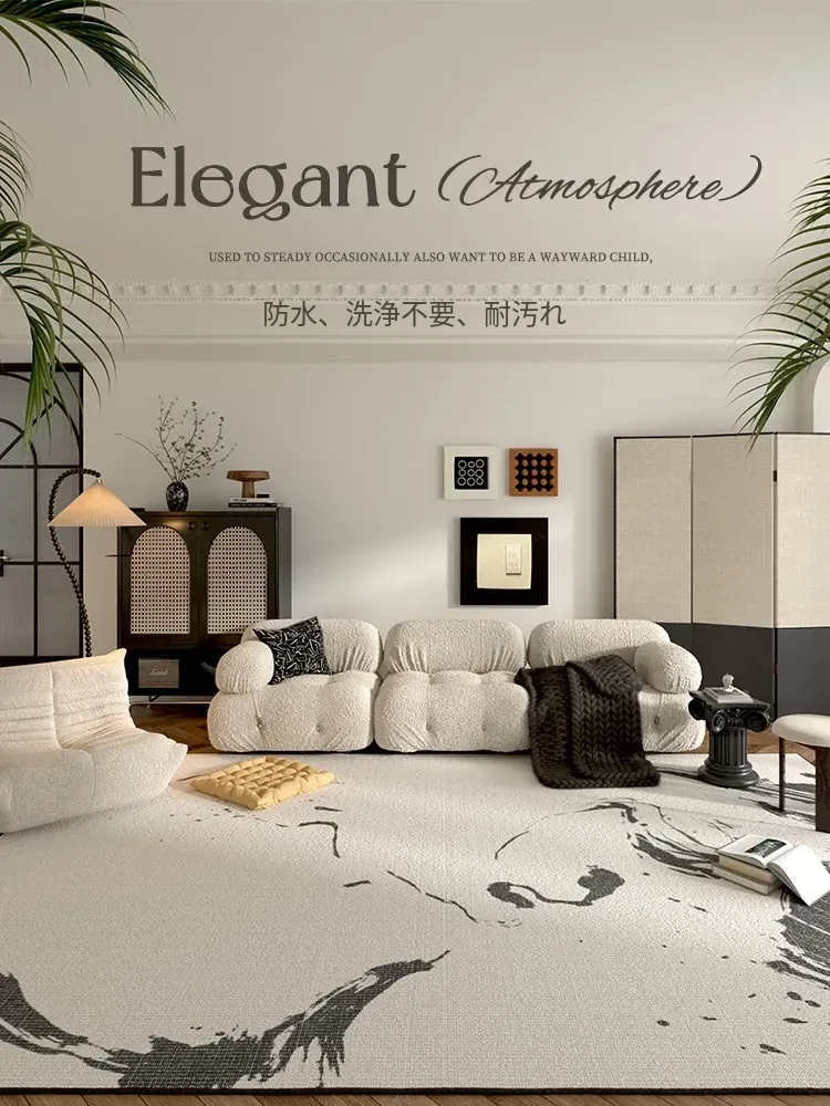 フレンチクリーム風リビングラグ モダンミニマル水墨デザイン ベッドサイドマット 高級感溢れるシンプルな和風スタイル