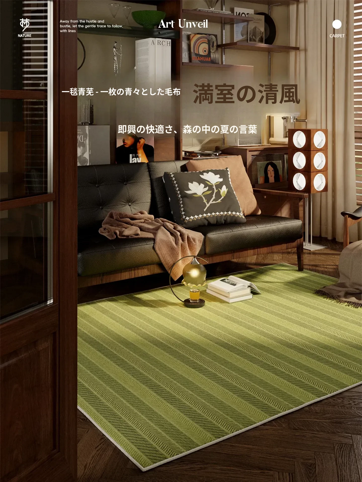 2025年新作!フレンチヴィンテージスタイルのリビング用グリーンカーペット - 洗浄不要、拭き取り可、防水・防汚機能付きで、軽やかなラグジュアリー感を演出します。