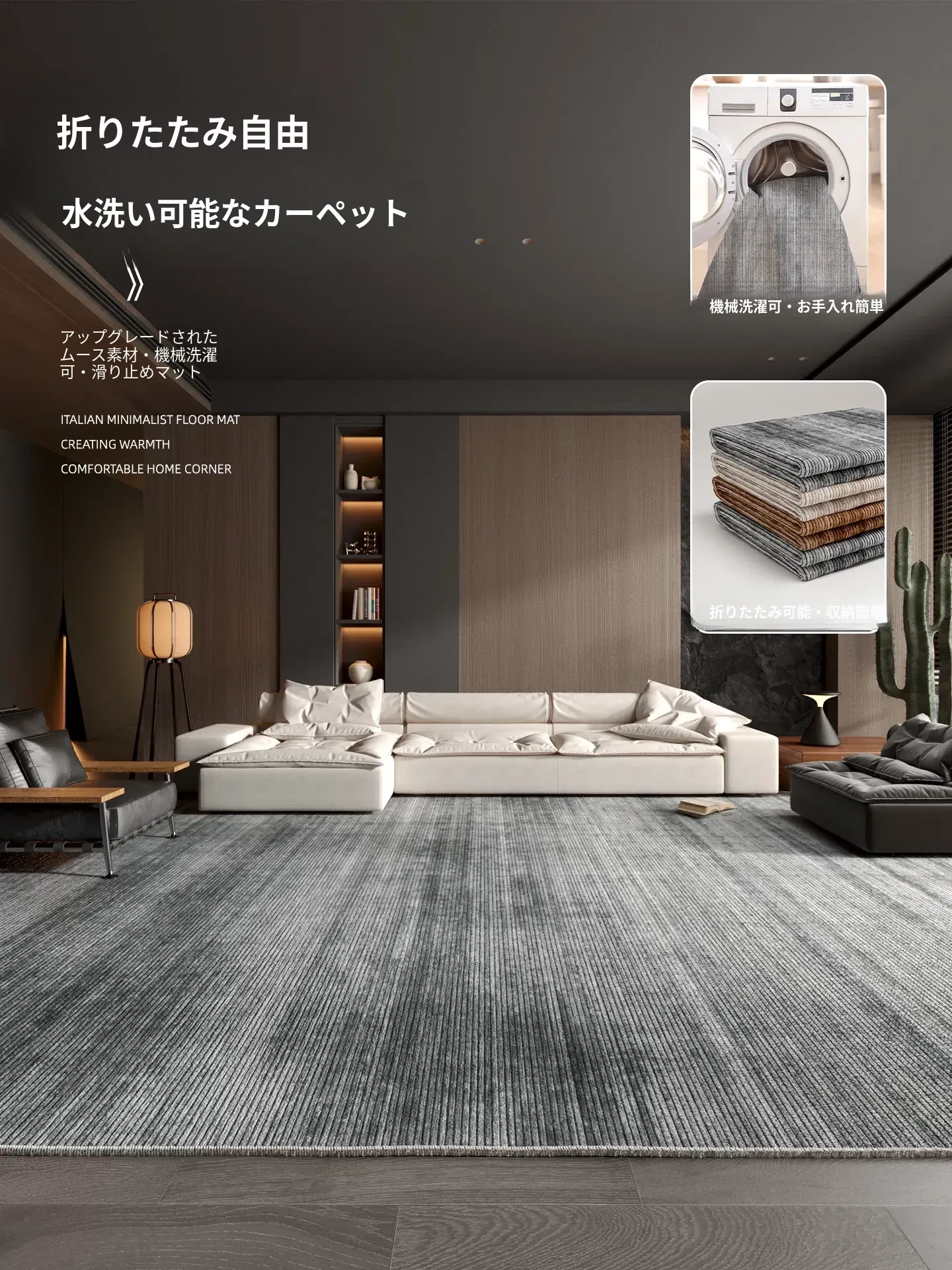 イタリアンミニマリストデザインの洗えるグレーラグ - 2025年新作、軽やかなラグジュアリー感漂う、リビングやベッドサイドに最適!