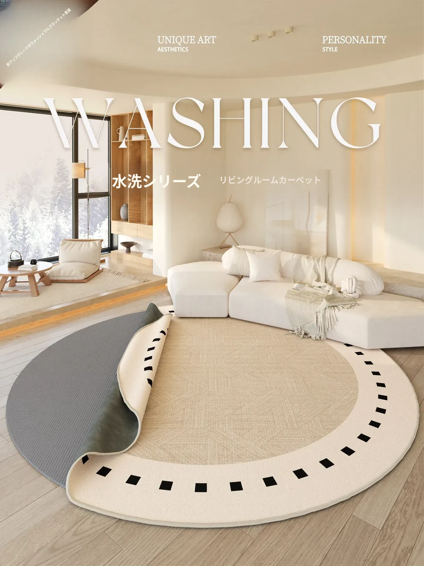 リビングルーム用の侘寂スタイルカーペット2025年新作!軽やかで高級感溢れるデザイン、洗濯不要でお手入れ簡単。防水機能付きで、シンプルなテーブルマットや寝室のフロアマットに最適です。